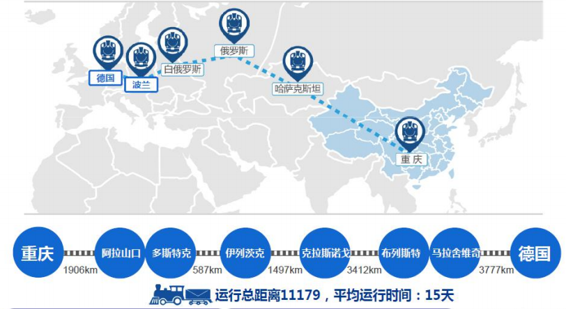英文名:Eurasia International Railway 始发站:中国重庆 终到站:德国杜伊斯堡 运营公司:中国铁路总公司等 全 长:11179公里 作 用:提升我国企业在欧盟市场的竞争力